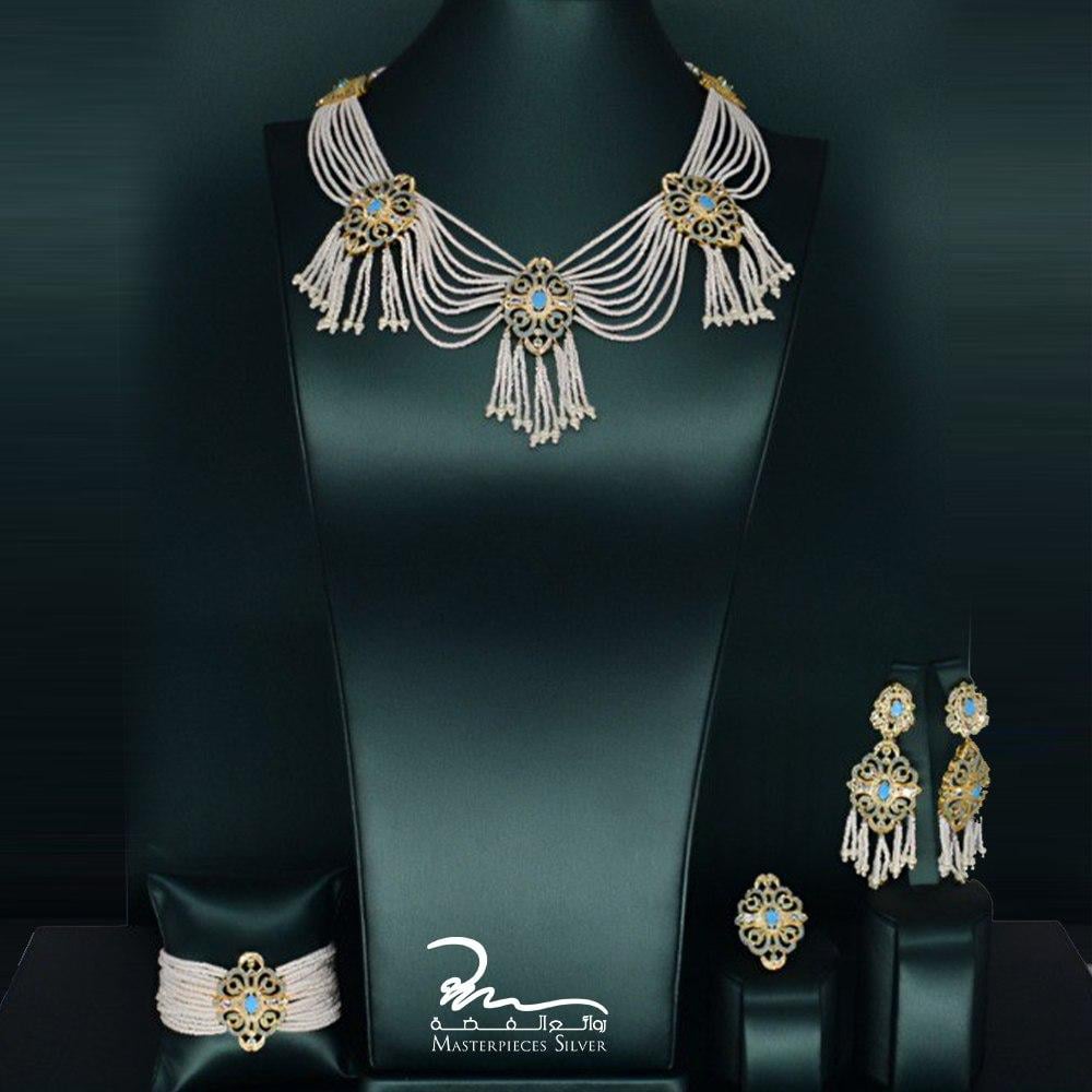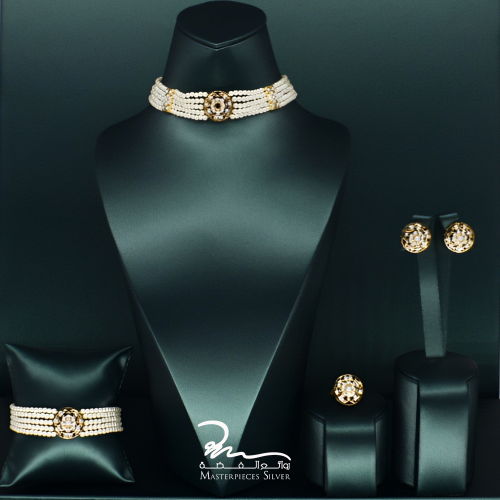 طقم لؤلؤ وفضة ملكي فاخر بتصميم شرقي من Masterpieces Silver – عقد، سوار، خاتم، وأقراط