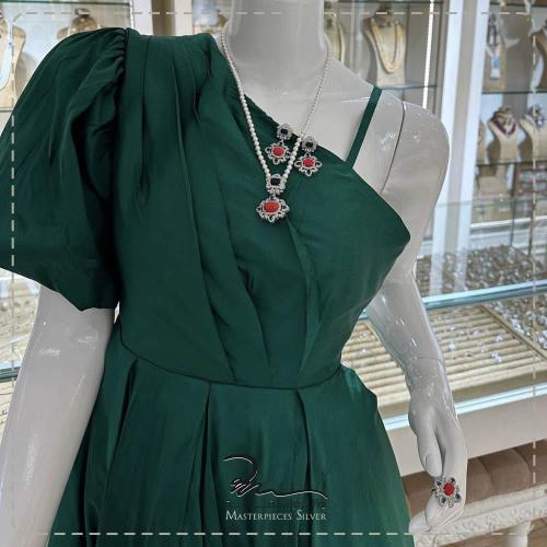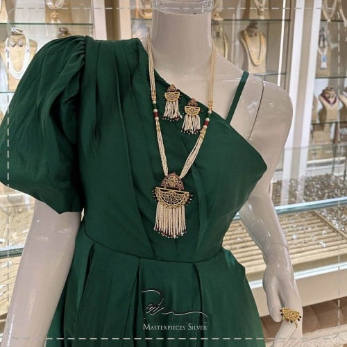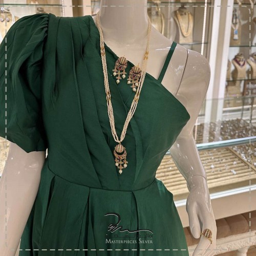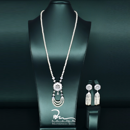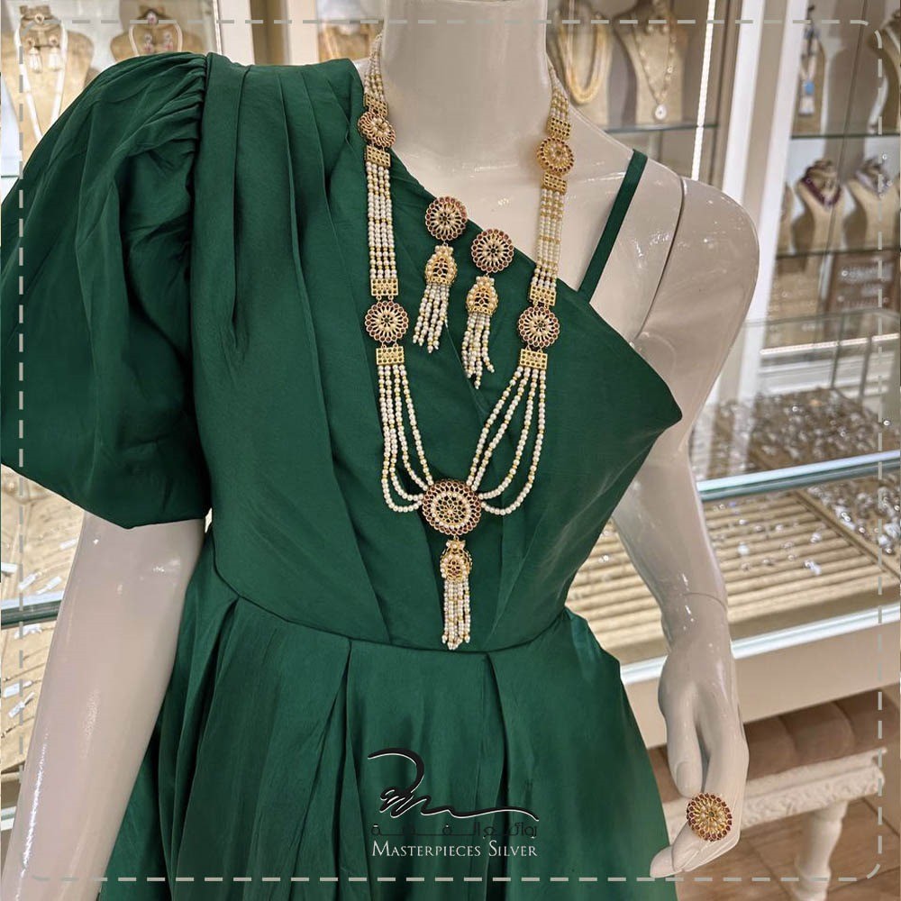 طقم لولو فضة مرصع بالأحجار الكريمه جاء طقم اللؤلؤ بتصاميم الهندية ويعتبر واحداً من أشهر وأجمل مجموعات المجوهرات في العالم، وهو يتميز بتصميمه الفريد الذي يجمع بين الأناقة والجمال، ويعكس تراث الثقافة الهندية الغنية.