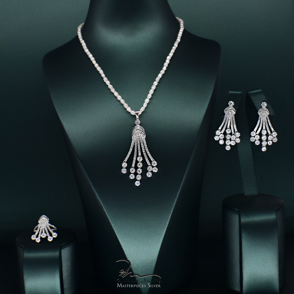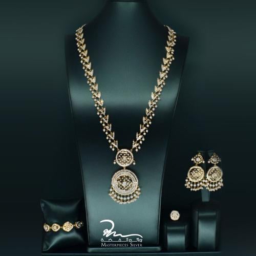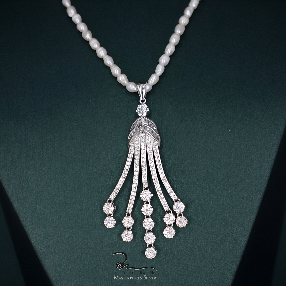 - العقد: سلسلة لؤلؤية أنيقة مع تعليقة ساحرة مزينة بأحجار الزركون براقة، تضفي لمسة من الجمال والفخامة.
