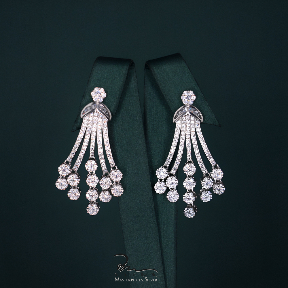 - الأقراط: فضة عيار 925 بتصميم متدلي عصري يتميز بالأناقة والبريق، ليبرز ملامحك بكل ثقة.