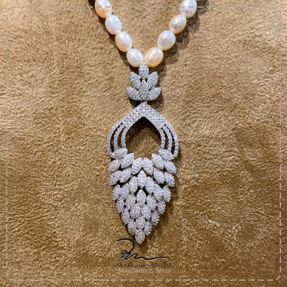 - العقد: سلسلة لؤلؤية أنيقة مع تعليقة ساحرة مزينة بأحجار الزركون براقة، تضفي لمسة من الجمال والفخامة.