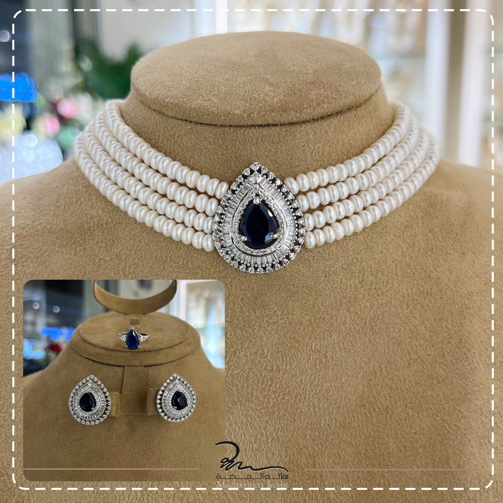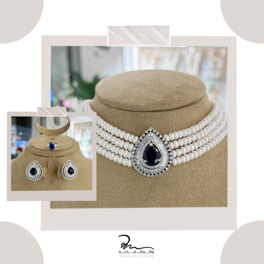 طقم لولو هندي انيق وفخم من اربعة قطع ( عقد-حلق-خاتم ) يصلح لجميع المناسبات، يأتي الطقم مرصع باحجار الزركون شبيه الالماس، فضة عيار 925 صنعت يدوياً باحترافيه عاليه حصرياً لروائع الفضة.