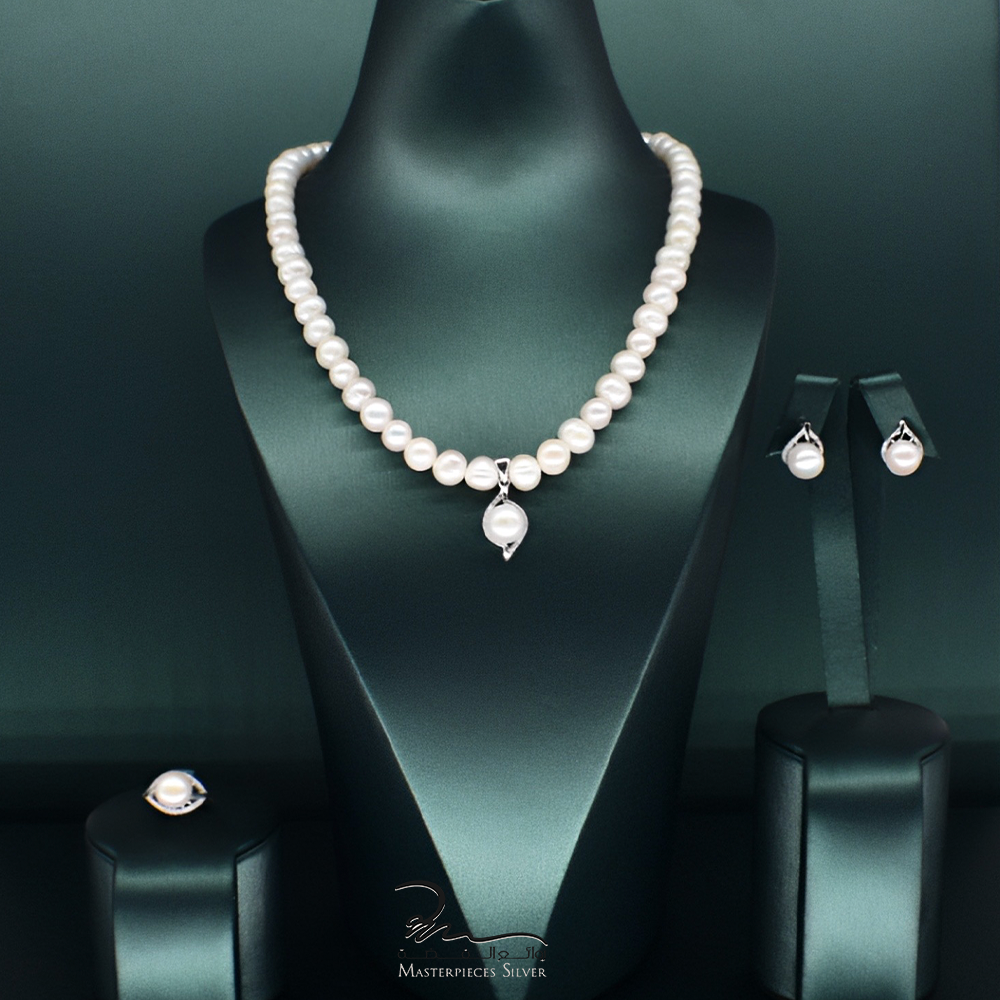 - العقد: سلسلة مصنوعة من حبات اللؤلؤ الطبيعي الأنيق مع تعليقة مزينة بفصوص زركون براقة تضفي لمسة من الفخامة.