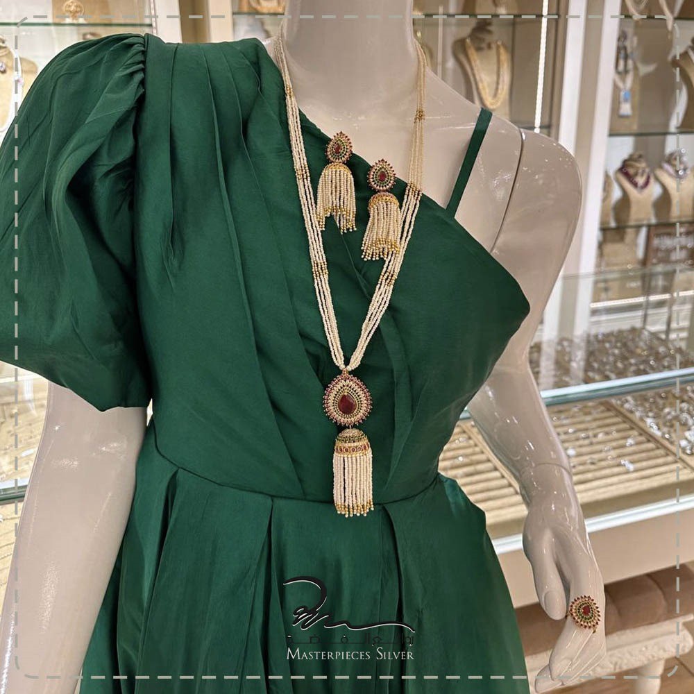 طقم لؤلؤ و فضة مرصع بالأحجار الكريمه جاء طقم اللؤلؤ بتصاميمه الهندية ويعتبر واحداً من أشهر وأجمل مجموعات المجوهرات في العالم، وهو يتميز بتصميمه الفريد الذي يجمع بين الأناقة والجمال والفخامة في الاطلالة .