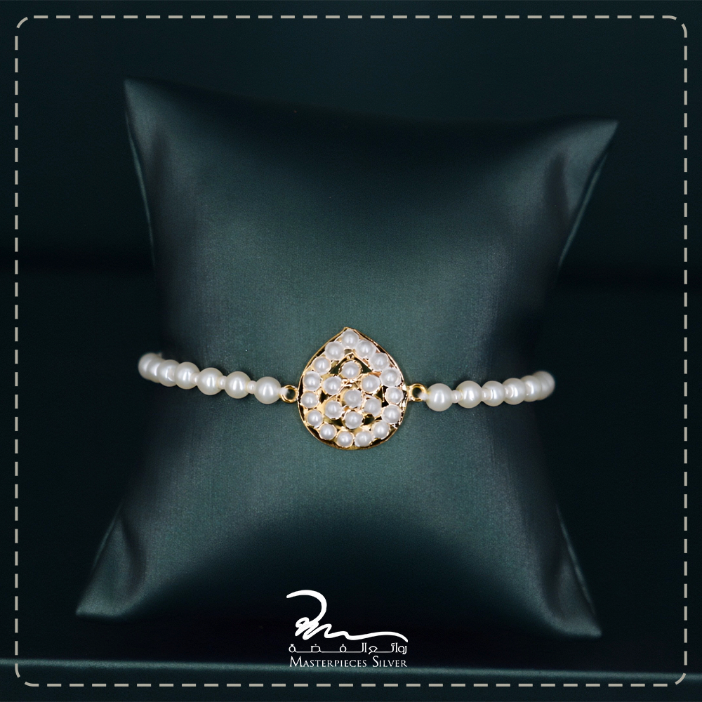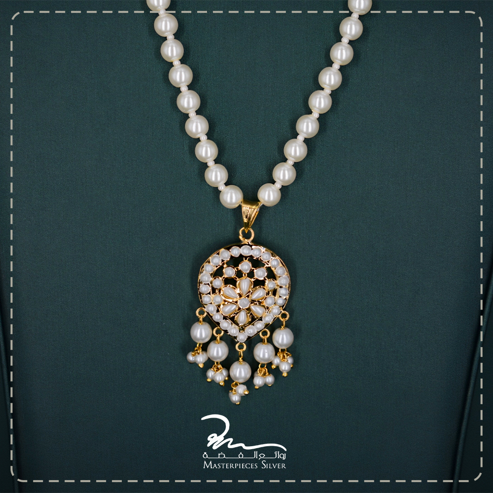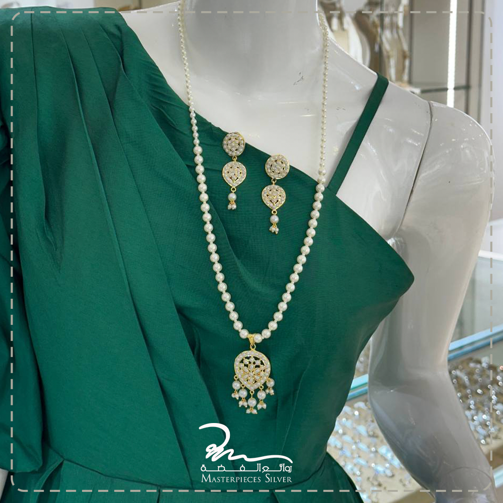 طقم لؤلؤ ابيض طويل بالاحجار الطبيعية مع حزام للخصر