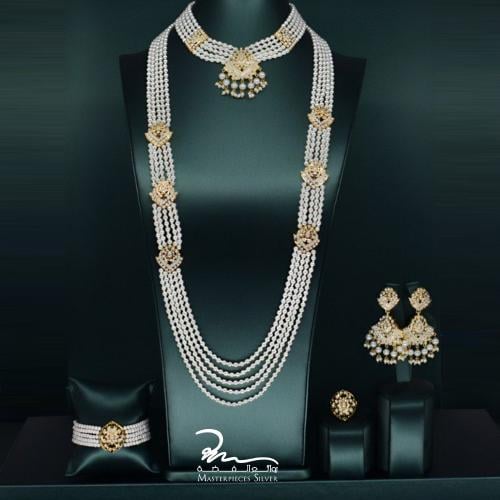 طقم لولو هندي انيق وفخم من اربعة قطع ( عقد-اسورة-حلق-خاتم ) يصلح لجميع المناسبات، يأتي الطقم مرصع بحجر الفيروز شبيه الالماس، فضة عيار 925 صنعت يدوياً باحترافيه عاليه حصرياً لروائع الفضة.