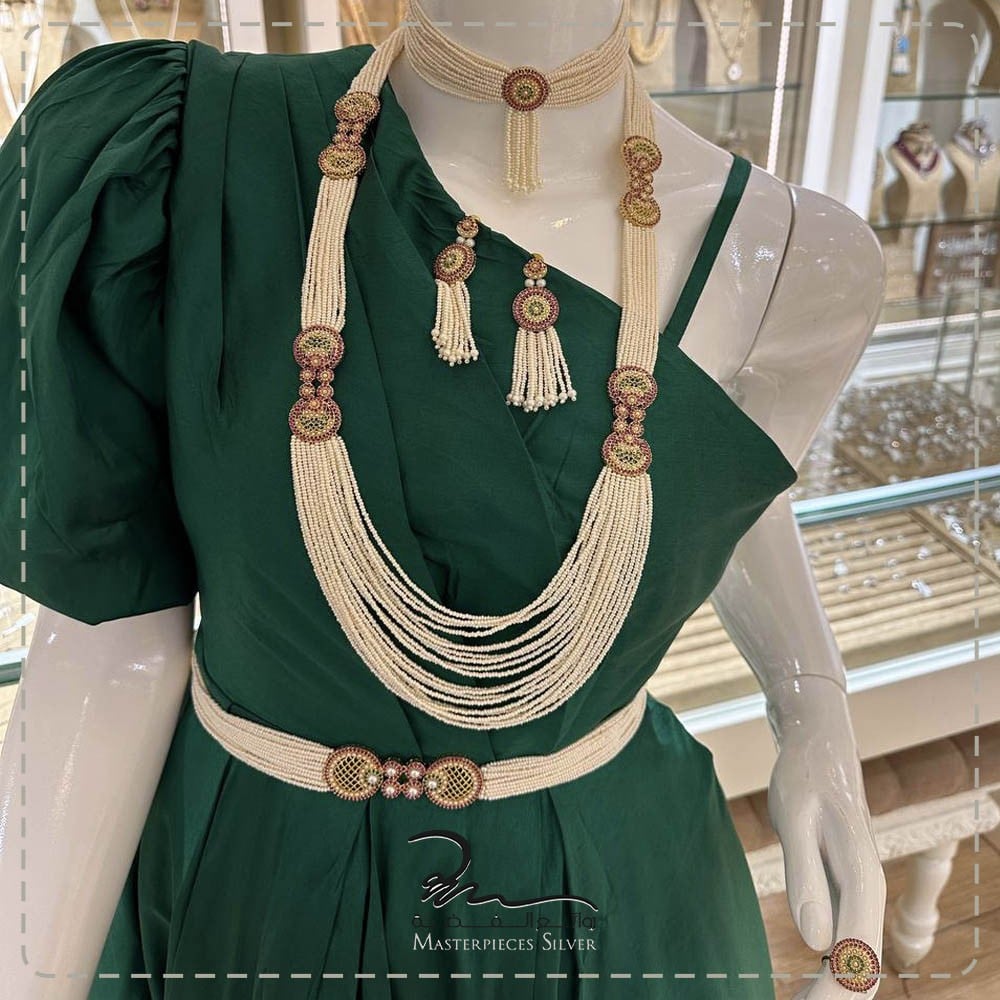 طقم لولو هندي كامل فخم مع الفضة والاحجار الكريمة ملونة طقم لؤلؤ من خمس قطع ( عقد طويل-عقد للرقبة-اسورة-حلق-خاتم ) يناسب ارتدائه في جميع المناسبات، يأتي الطقم مرصع باحجار الزركون شبيه الالماس، فضة عيار 925 صنعت يدوياً باحترافيه عاليه حصرياً لروائع الفضة.