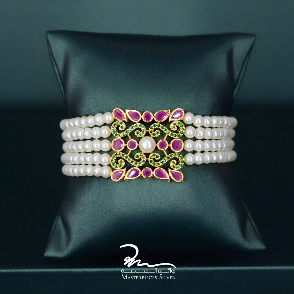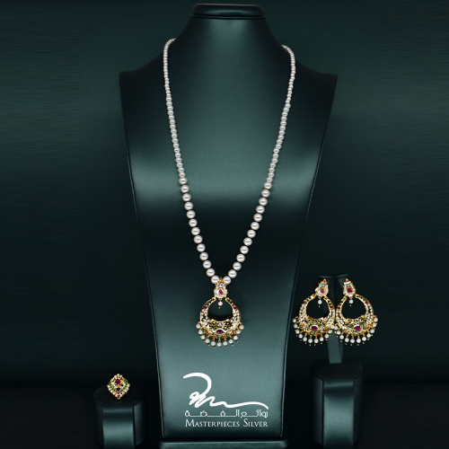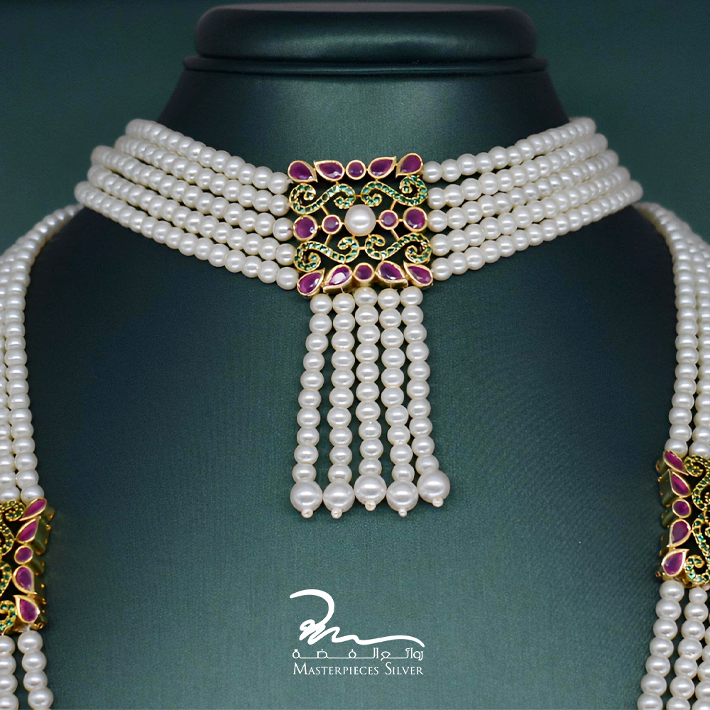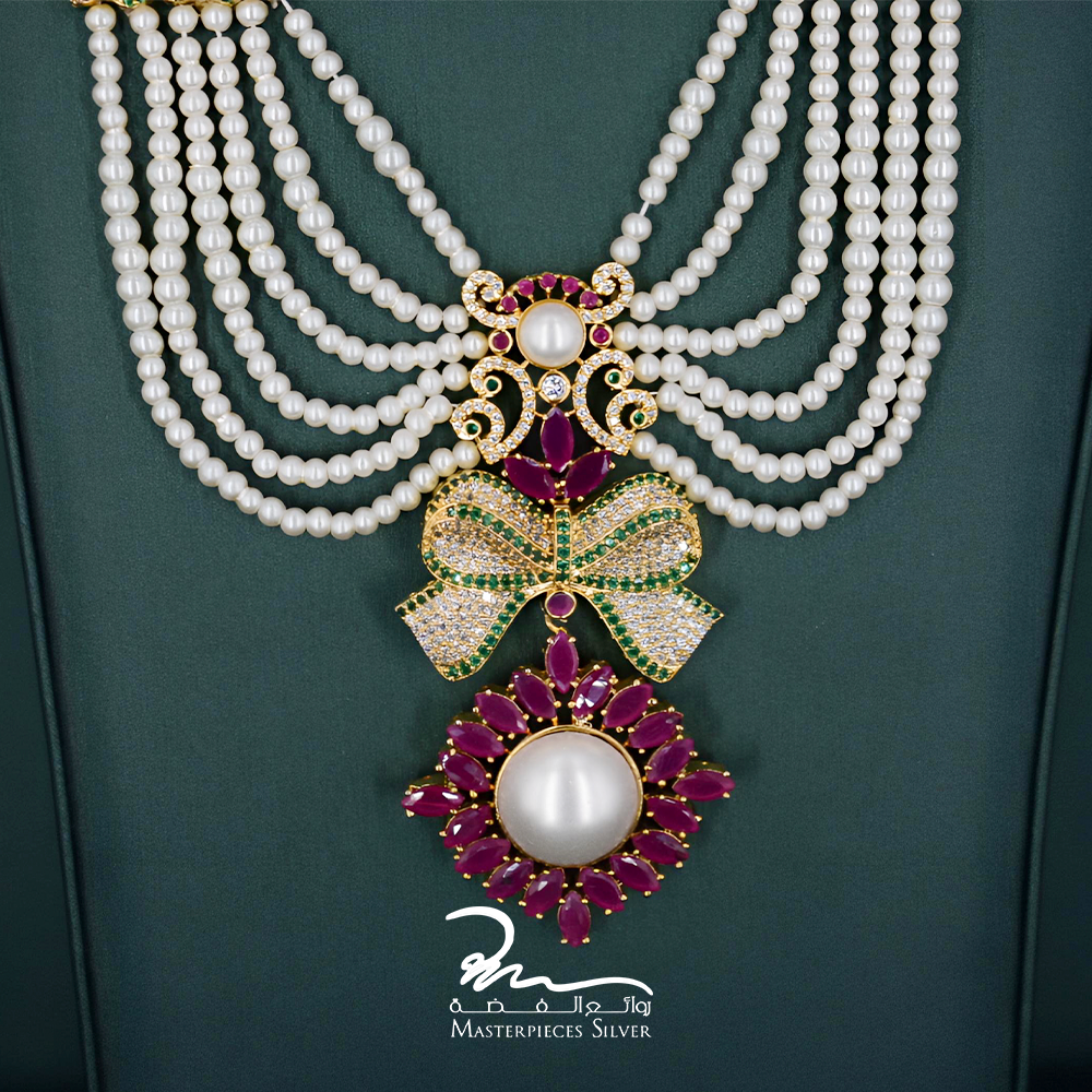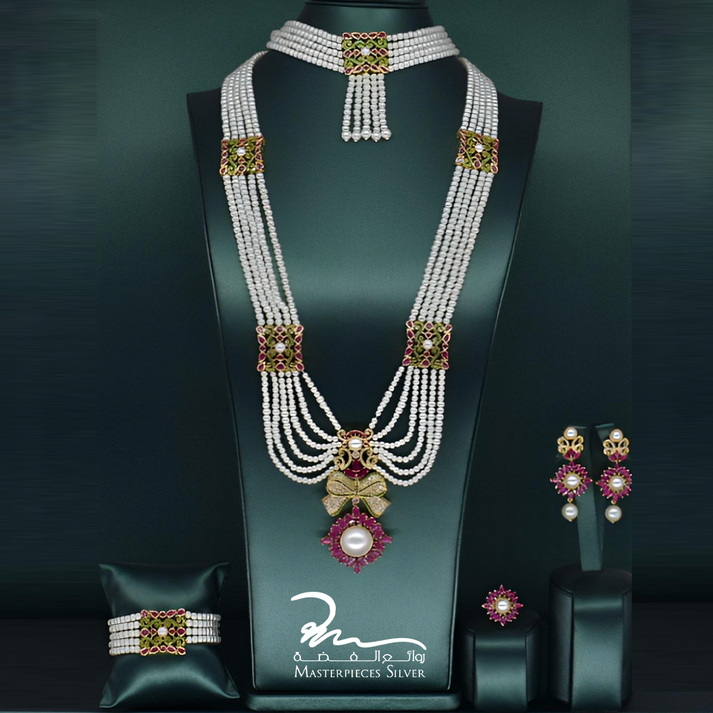 طقم لؤلؤ ملكي بزخارف متنوعة– Masterpieces Silver تميّزي بإطلالة فريدة تجمع بين التراث والفخامة العصرية مع هذا الطقم الملكي المصمم من اللؤلؤ والفضة النقية، والمطعّم بزخارف ملوّنة مستوحاة من الفنون . طقم فخم يعبّر عن الرقي والذوق الرفيع، مناسب للنساء الباحثات عن التفرد في مناسباتهن الخاصة.