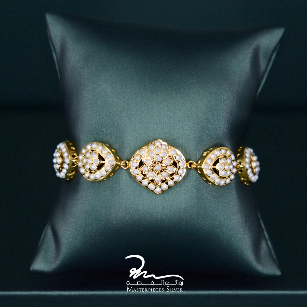 تتميز هذه القطعة الفريدة بتصميمها الهندي الفاخر المصنوع من الفضة المطلية بالذهب، مع لمسات من الأحجار اللامعة واللؤلؤ الذي يضفي لمسة كلاسيكية ساحرة. يتكون الطقم من: