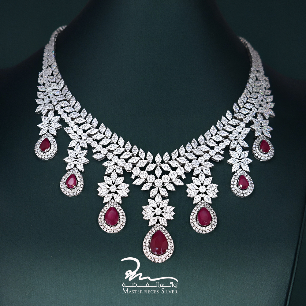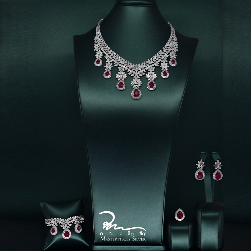 جاء طقم فضة نسائي، بمجموعة من قطع المجوهرات الفخمة، التي تناسب فقط صاحبات الذوق الرفيع، فتم تصميم كل قطعة به بحب وعنابة خاصة، ويحتوي الطقم الفضة على عقد وخاتم و إسورة وحلق، تم تصميمهم بشكل راقي للغاية، ويتزينوا بأحجار الزركون الماسية.