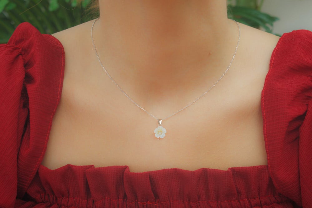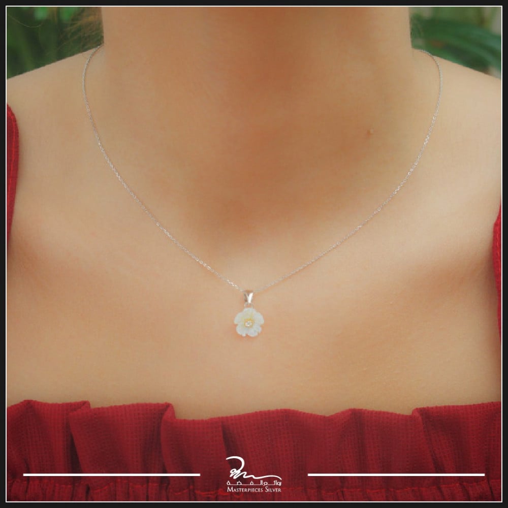 مصنوعة من الفضة خالص عيار 925 وتصميم عبارة على سلسلة ناعمة ،حلقة ناعمة رقيقة شكل وردة من حجر زركون خفيف تنزل على الرقبة بنعومة.